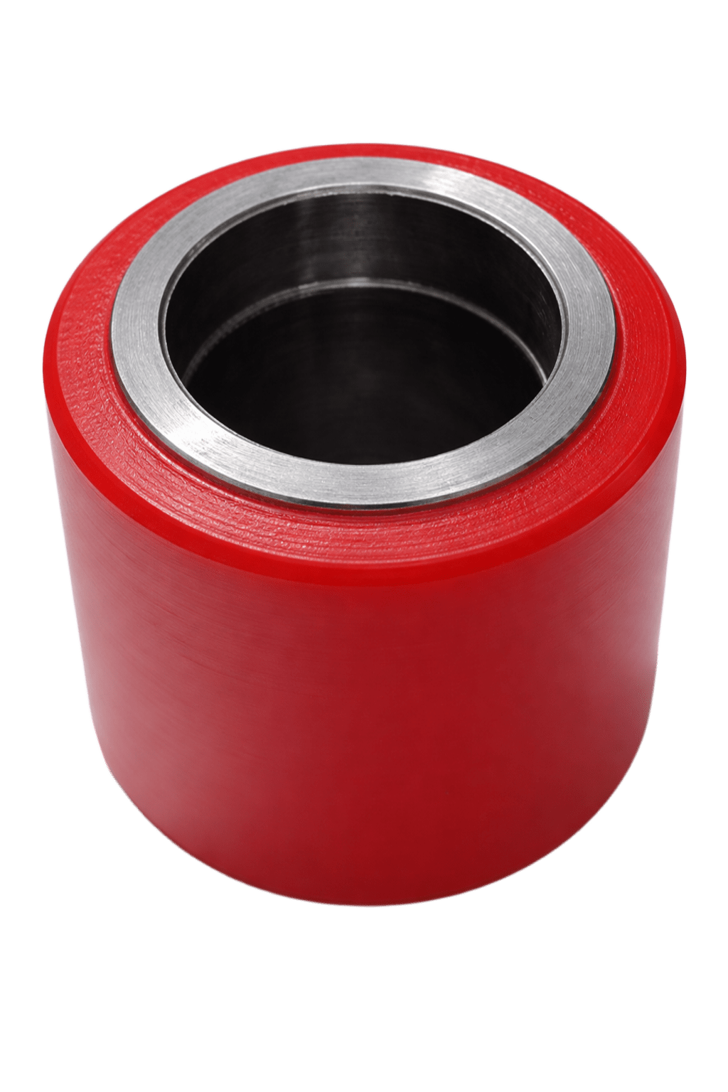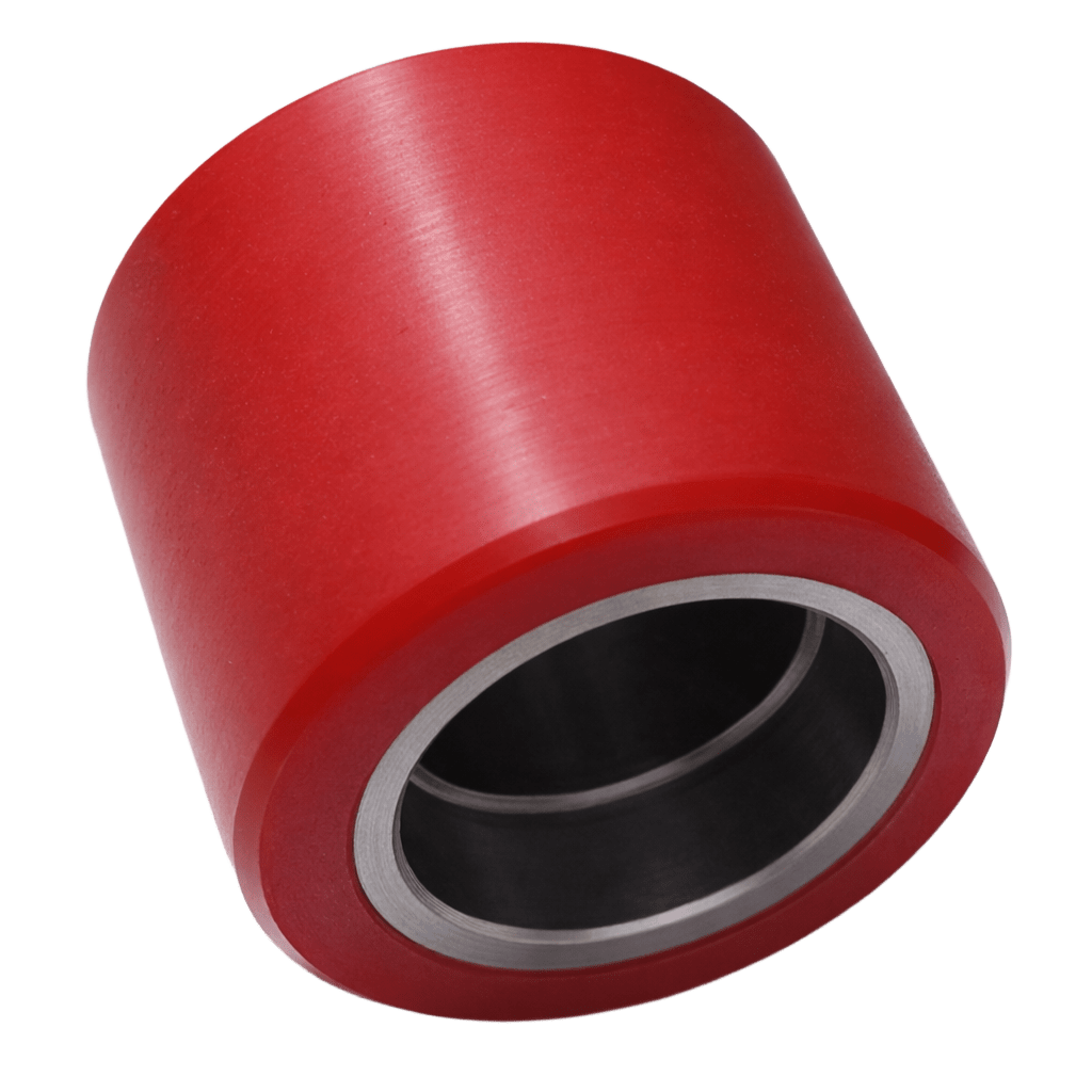 Rodillo de poliuretano de alta resistencia, ideal para reemplazo en zorras manuales de perfil bajo.